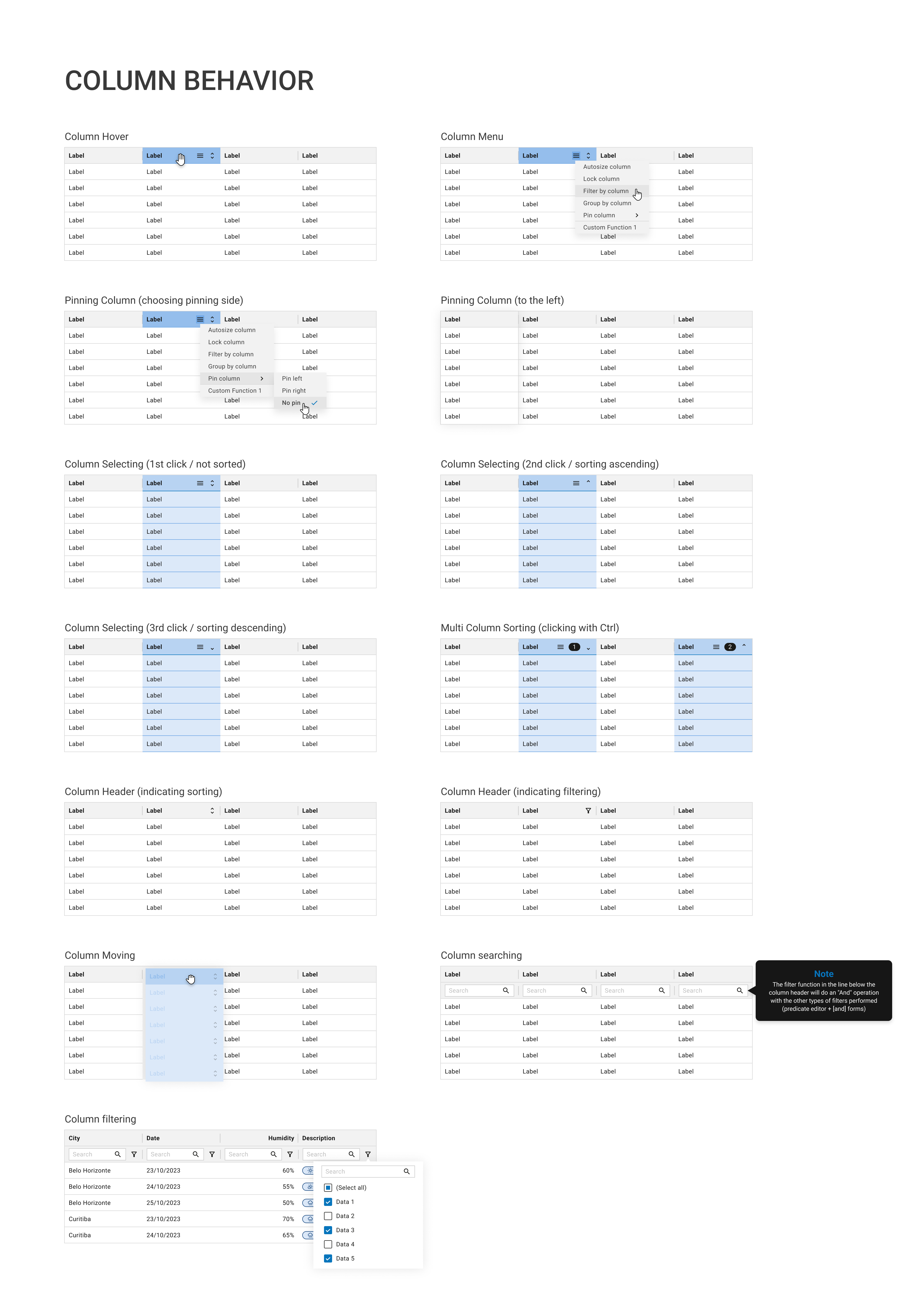 We started the prototypes by defining the most basic interactions for the table cells, including cell selection and row selection. We also defined the possible interactions and functionalities for the table header and the table pagination modes.