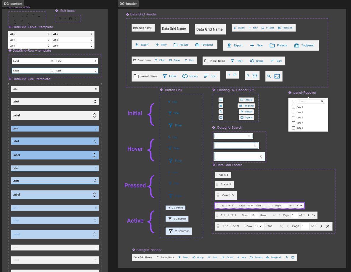 In parallel, we also defined the construction of the components that would make up the data-grid. We chose to break the component into smaller subcomponents, such as the cell, header, footer, and the filter, sorting, and grouping panels.